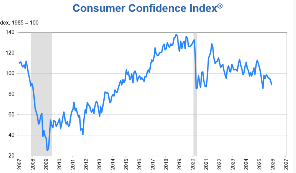 世界大型企業(yè)研究會(huì)首席經(jīng)濟(jì)學(xué)家達(dá)娜·彼得森表示,盡管11月的數(shù)據(jù)因聯(lián)邦政府“停擺”結(jié)束而被向上修正,12月消費(fèi)者信心再次下滑并依然遠(yuǎn)低于今年1月的峰值。消費(fèi)者信心指數(shù)5個(gè)成分指數(shù)中有4個(gè)出現(xiàn)下降,另一個(gè)表現(xiàn)明顯疲弱。