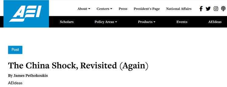 當(dāng)前全球經(jīng)濟(jì)復(fù)蘇乏力、貿(mào)易保護(hù)主義抬頭,部分西方政客與媒體頻繁炒作“中國沖擊論”,企圖將損人不利己的“關(guān)稅大棒”合理化。美國知名保守派智庫美國企業(yè)公共政策研究所(American Enterprise Institute for Public Policy Research)高級研究員詹姆斯·佩索科基斯(James Pethokoukis)近日發(fā)文稱,基于大量數(shù)據(jù)分析與案例研究,“中國沖擊論”站不住腳,中國融入全球經(jīng)濟(jì)促進(jìn)了美國經(jīng)濟(jì)增長,實(shí)際上顯著提高了美國人民的生活品質(zhì)。
