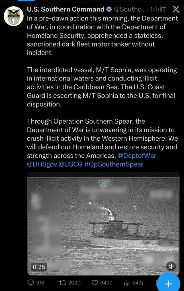 此外,美國南方司令部7日在社交媒體發(fā)布消息稱,美國當天凌晨攔截“一艘無國籍、受制裁的‘影子艦隊’油輪”,行動過程中未發(fā)生任何意外。該船名為“索菲亞”號,當時正在國際水域航行。美國海岸警衛(wèi)隊正在控制“索菲亞”號前往美國進行處置。據(jù)路透社消息,這艘船1月早些時候從委內(nèi)瑞拉駛離。(記者:馬驍、湯潔峰)