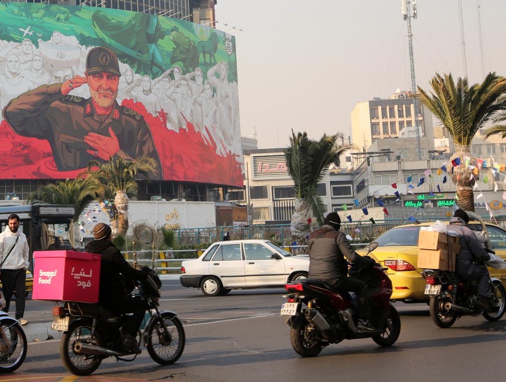 2026年1月6日,在伊朗首都德黑蘭街頭,車(chē)輛經(jīng)過(guò)一幅繪有伊遇襲身亡的高級(jí)將領(lǐng)卡西姆·蘇萊曼尼形象的宣傳海報(bào)。新華社發(fā)