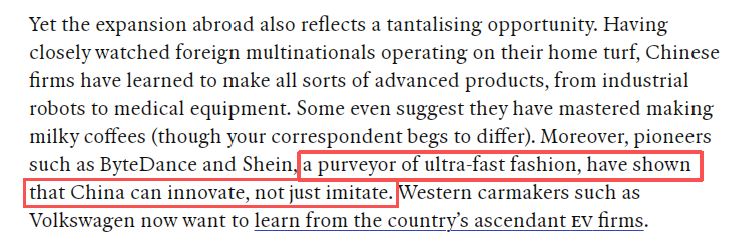 文章分析認(rèn)為,中國企業(yè)在海外的影響力正逐年增強(qiáng),覆蓋國家多元,涉足行業(yè)日益廣泛。去年中國某電動汽車制造商的銷量超越了美國龍頭特斯拉。中國AI模型正被全球采用,不僅受發(fā)展中國家青睞,一些西方企業(yè)也在使用。