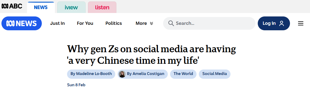 澳大利亞廣播公司2月8日發(fā)表題為《為何Z世代在社交媒體上開啟“我的人生很中國(guó)”時(shí)刻?》