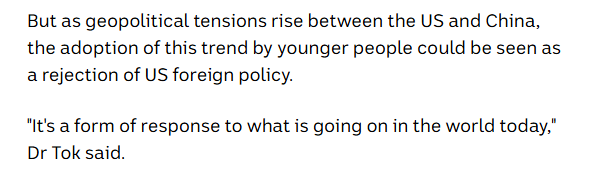 文章還說(shuō),許多創(chuàng)作“中國(guó)時(shí)刻”視頻的博主居住在美國(guó)。墨爾本大學(xué)亞洲研究院講師杜兆愷分析,年輕人的這種文化選擇或許是對(duì)美國(guó)外交政策的隱性反抗?!斑@是對(duì)當(dāng)今世界格局的回應(yīng)?!?/p>
