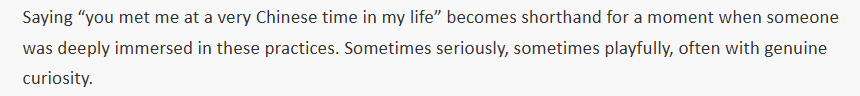 文章說(shuō),這句話的核心,折射出一種對(duì)中國(guó)文化的深度體驗(yàn)。它關(guān)注的往往不是宏大儀式,而是日常習(xí)慣,使用這句話的人通常并非在談?wù)撜Z(yǔ)言能力或傳統(tǒng),而是在描述那些細(xì)微卻切實(shí)的身體力行:改喝熱茶而非冰飲、為養(yǎng)生而非圖省事選擇食物、注意腳部保暖、講究飲食平衡與休養(yǎng)……