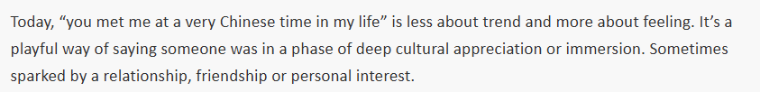 日本英文雜志《大都市》分析說(shuō),“你遇見了我人生中‘很中國(guó)’的時(shí)刻”,便成了沉浸于這類實(shí)踐的代名詞——有時(shí)認(rèn)真,有時(shí)輕松,但總帶著真誠(chéng)的好奇。