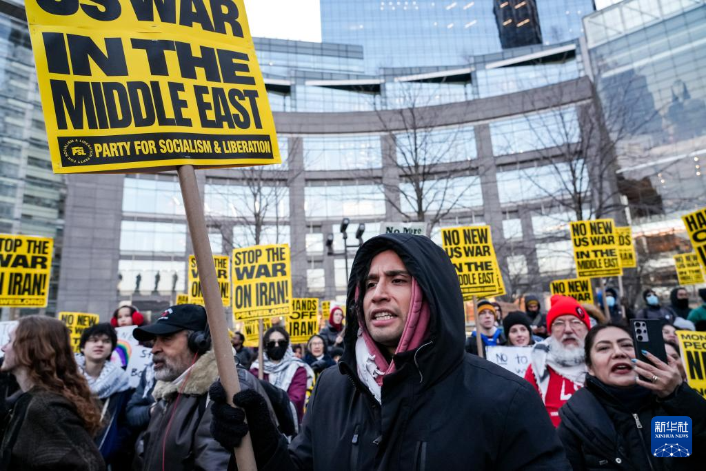 2日傍晚,數(shù)百名抗議者冒著嚴(yán)寒在紐約市哥倫布圓形廣場(chǎng)集會(huì),組織方代表發(fā)表演講,人們手持標(biāo)語(yǔ),大聲呼喊反戰(zhàn)口號(hào),要求“停止針對(duì)伊朗的戰(zhàn)爭(zhēng)”,隨后開始游行示威。