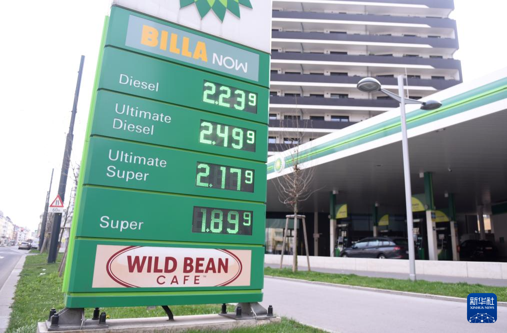 這是3月24日在奧地利首都維也納拍攝的一處加油站的價目表。新華社記者 賀燦鈴 攝