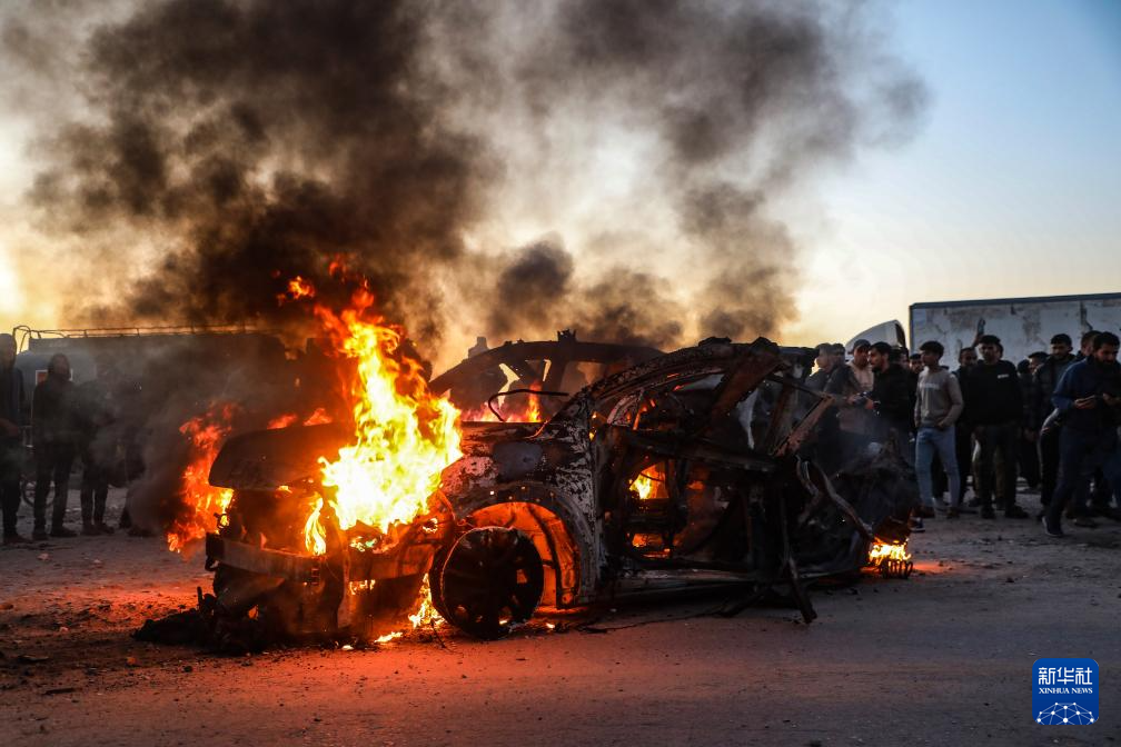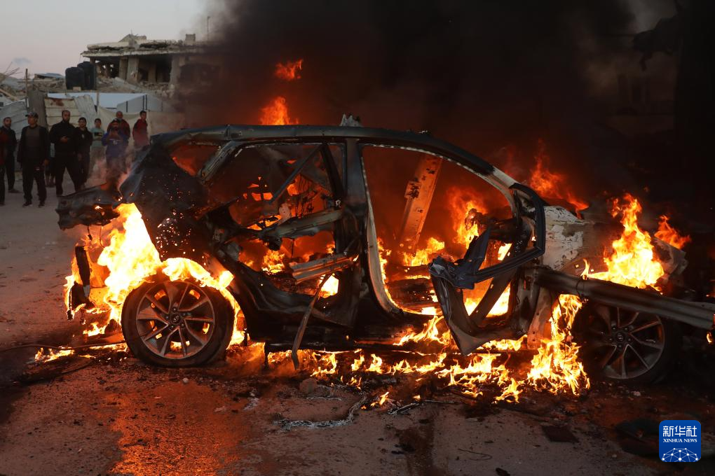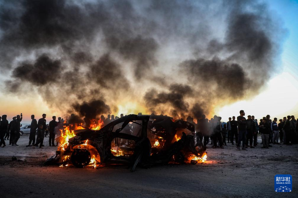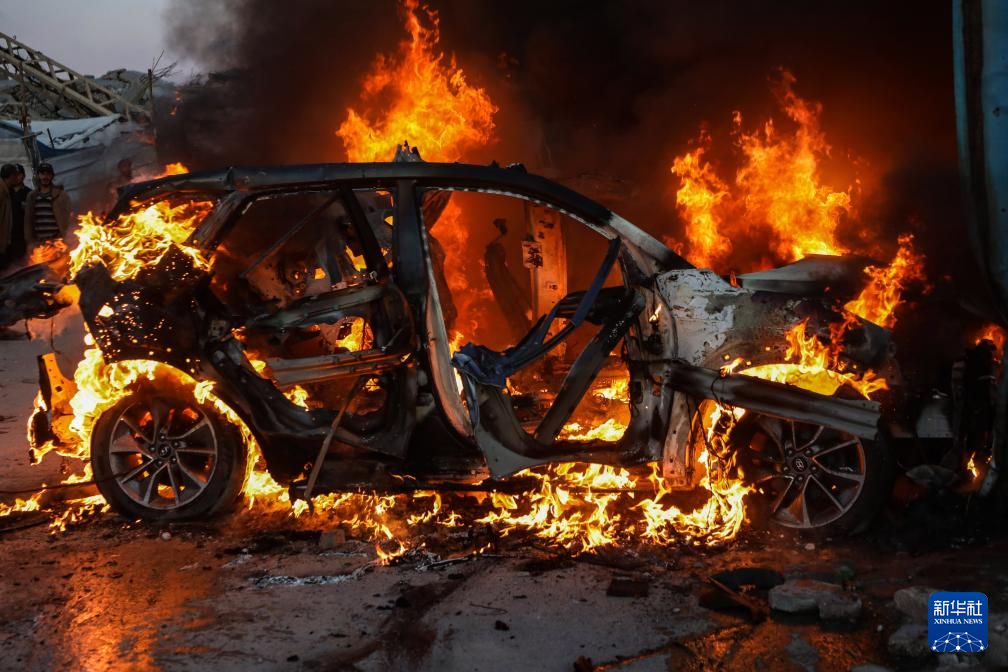 這是4月8日在加沙城拍攝的遭以軍空襲后起火的車輛,車內一名半島電視臺記者遇難。新華社發(fā)(里澤克·阿卜杜勒賈瓦德攝)