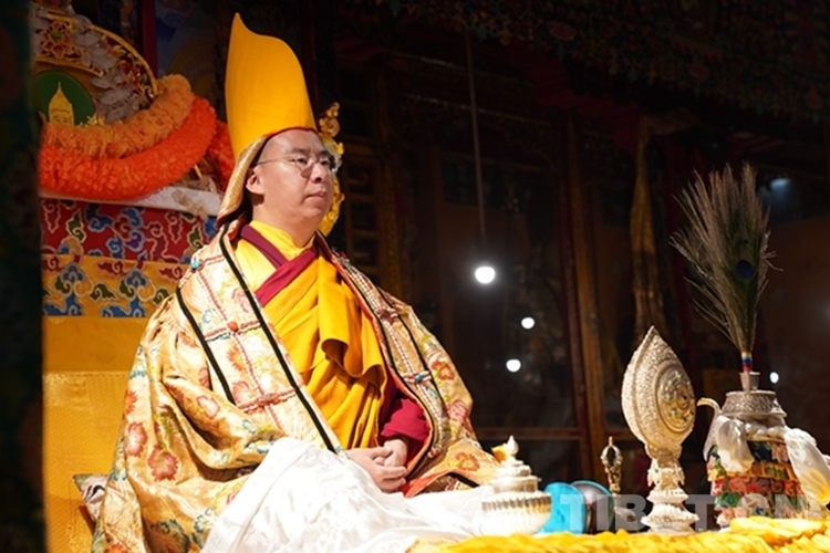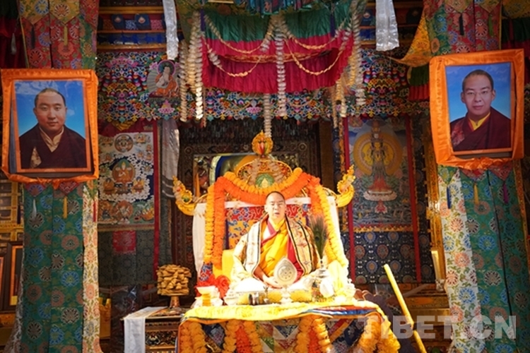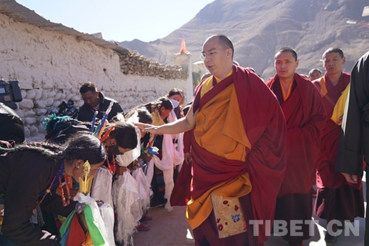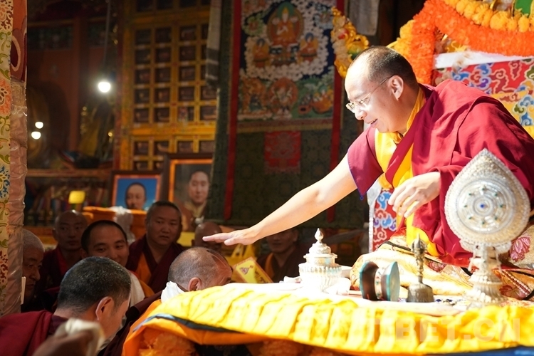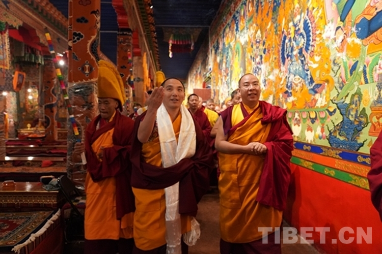 當(dāng)日12時許,班禪一行抵達(dá)日吾其鄉(xiāng),班禪笑容慈和地一一為等候在寺廟前的信教群眾摸頂,并向表演迥巴藏戲的信教群眾揮手致意。隨后,手持香爐的高僧和吹嗩吶的僧人引路,在手持黃傘的高僧護(hù)送下,班禪緩步進(jìn)入主殿,朝拜大威德金剛拉康,參觀石刻、擦擦文物陳列室后登上大殿寶座,向寺廟僧眾傳授《勝道啟門頌》,為僧眾摸頂。