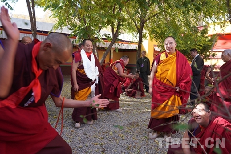 圖為班禪在扎西吉培寺辯經(jīng)場觀摩僧人辯經(jīng) 攝影:王淑