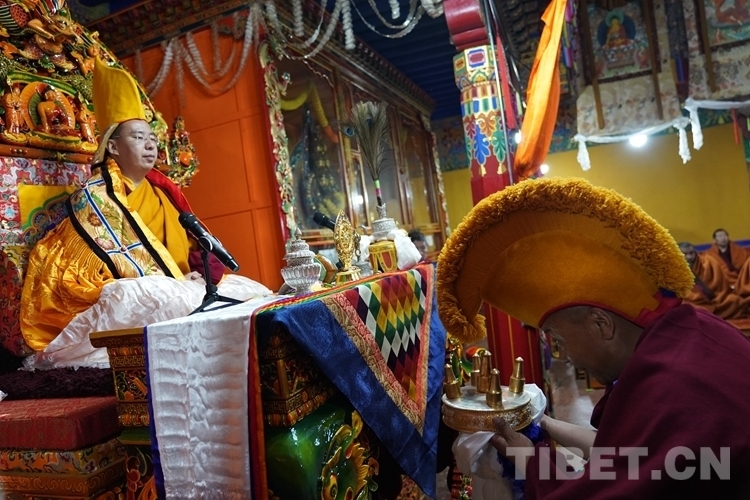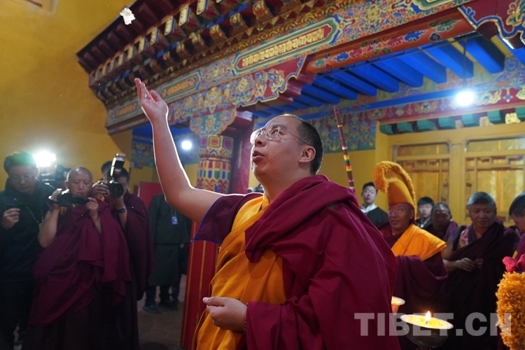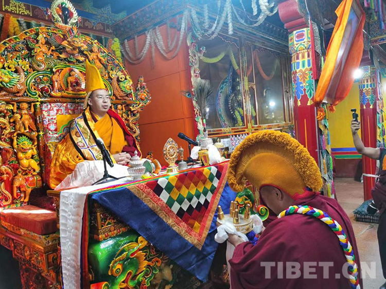 當(dāng)日的拉定寺裝飾一新,班禪一行抵達(dá)后,現(xiàn)場(chǎng)法號(hào)齊鳴、法螺合奏,倫珠晉巴和僧眾在寺廟前舉行了隆重的歡迎儀式。隨后,在手持香爐、寶傘高僧的引導(dǎo)護(hù)送下,班禪步入主殿上寶座,向寺廟僧眾傳授《三主要道論》,為僧眾摸頂賜福、發(fā)放布施。
