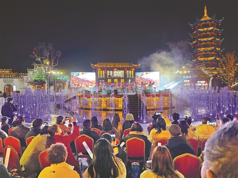 在湖北省云夢縣博物館里,古老藏戲與千年秦簡隔空對話;在祥云灣文旅景區(qū)音樂噴泉舞臺上,《吉祥昂仁》藏戲舞演員宛如格?;ㄊ㈤_在水光瀲滟間;在楚王天下大舞臺上,《大鵬山》六弦琴音雄渾豪邁、舞步粗獷奔放,將神山的巍峨與雪域的壯闊搬到江漢平原;在胡金店萬畝油菜花海中,《多彩的哈達(dá)》為春日花海增添了濃郁的民族風(fēng)情;在安陸、孝昌等周邊縣市,《同心結(jié)·幸福緣》舞蹈節(jié)奏歡快、《日喀則我為你牽掛》三重唱旋律悠揚,將高原遼闊與南國柔美完美融合……