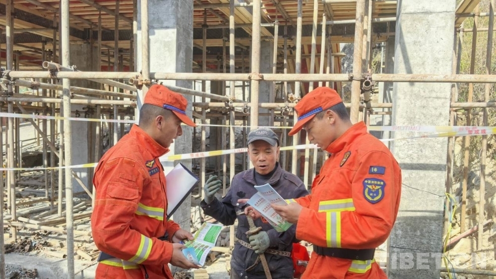 消防員指戰(zhàn)員向施工人員講解防火知識(shí)