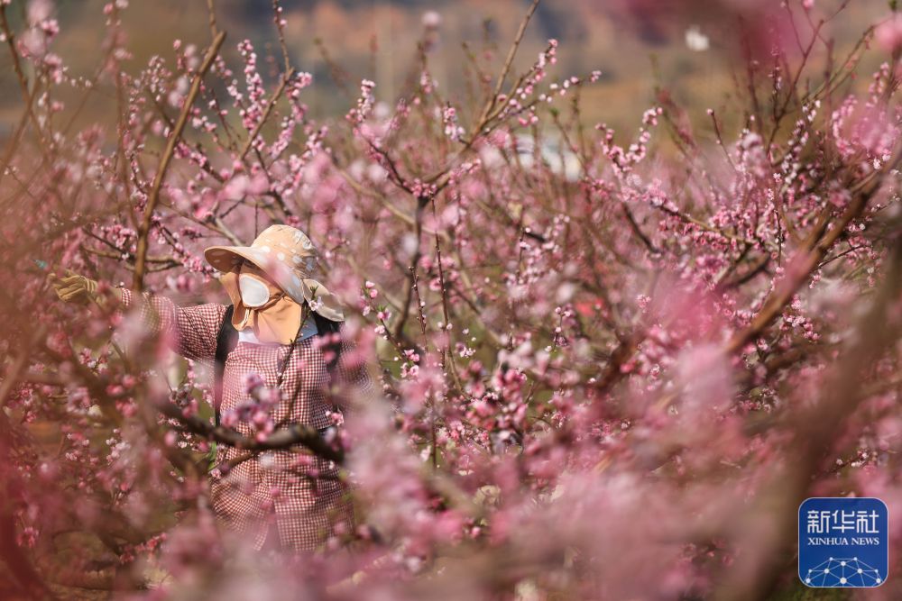 3月17日,在云南省曲靖市沾益區(qū)盤江鎮(zhèn)河西村桃園基地,果農(nóng)在果園進(jìn)行管護(hù)作業(yè)。新華社發(fā)(孫文來攝)
