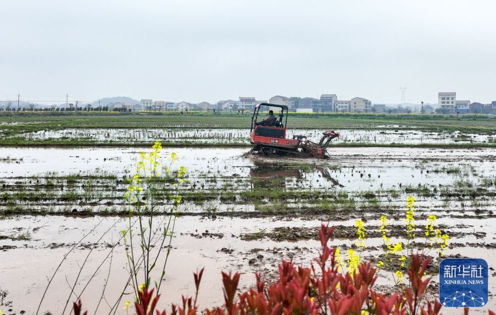 3月17日,在湖南省衡陽市衡陽縣西渡鎮(zhèn)青里村,村民駕駛農(nóng)機(jī)翻耕農(nóng)田(無人機(jī)照片)。新華社發(fā)(周秀魚春攝)