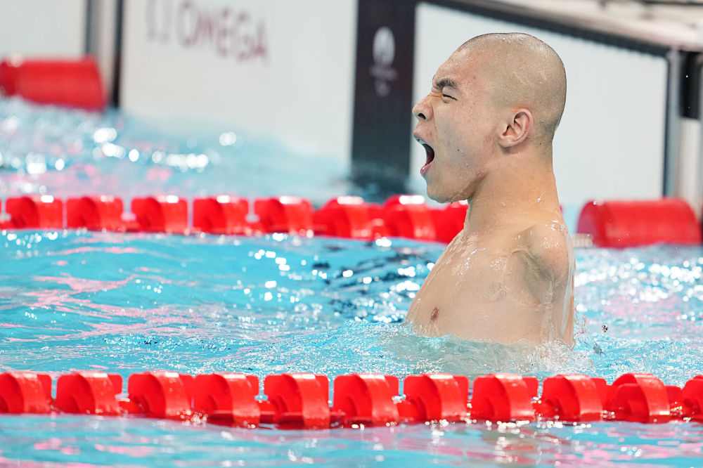 巴黎殘奧會(huì)游泳男子50米蝶泳S5級(jí)決賽,郭金城在打破世界紀(jì)錄后慶祝。新華社記者 熊琦 攝
