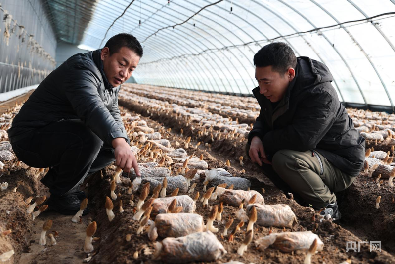 鄭福來(右)向鎮(zhèn)干部介紹羊肚菌(央廣網發(fā) 邵云哲 攝)