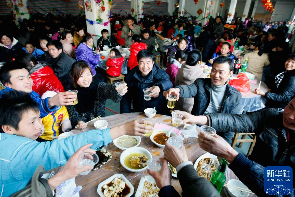 2011年2月2日,浙江諸暨一家公司準(zhǔn)備了豐盛的年夜飯,招待800多名沒有回家過年的員工及其家屬,歡聚一堂共迎新年。新華社發(fā)(郭斌 攝)