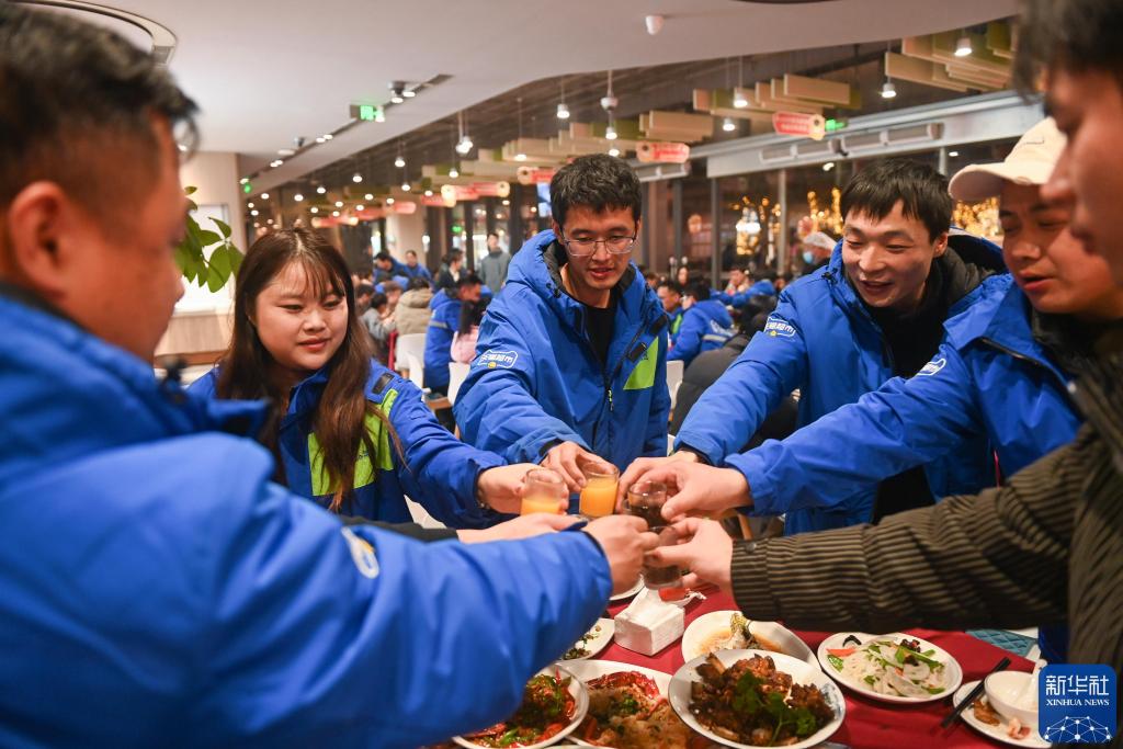 2025年1月22日,快遞員和家屬在“年夜飯”活動上碰杯。當(dāng)日,200余名大部分來自外地的快遞員及家屬受邀參加一場“年夜飯”活動,提前在異鄉(xiāng)感受春節(jié)團(tuán)聚的溫暖。 新華社記者 黃宗治 攝