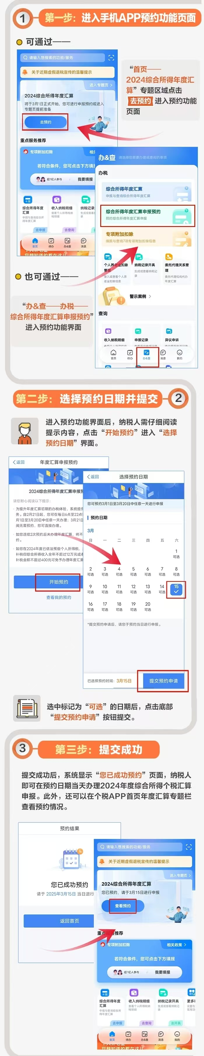 如需在3月1日至3月20日之間辦理年度匯算,可在2月21日至3月20日每天6時至22時登錄手機個人所得稅APP進行預約。
