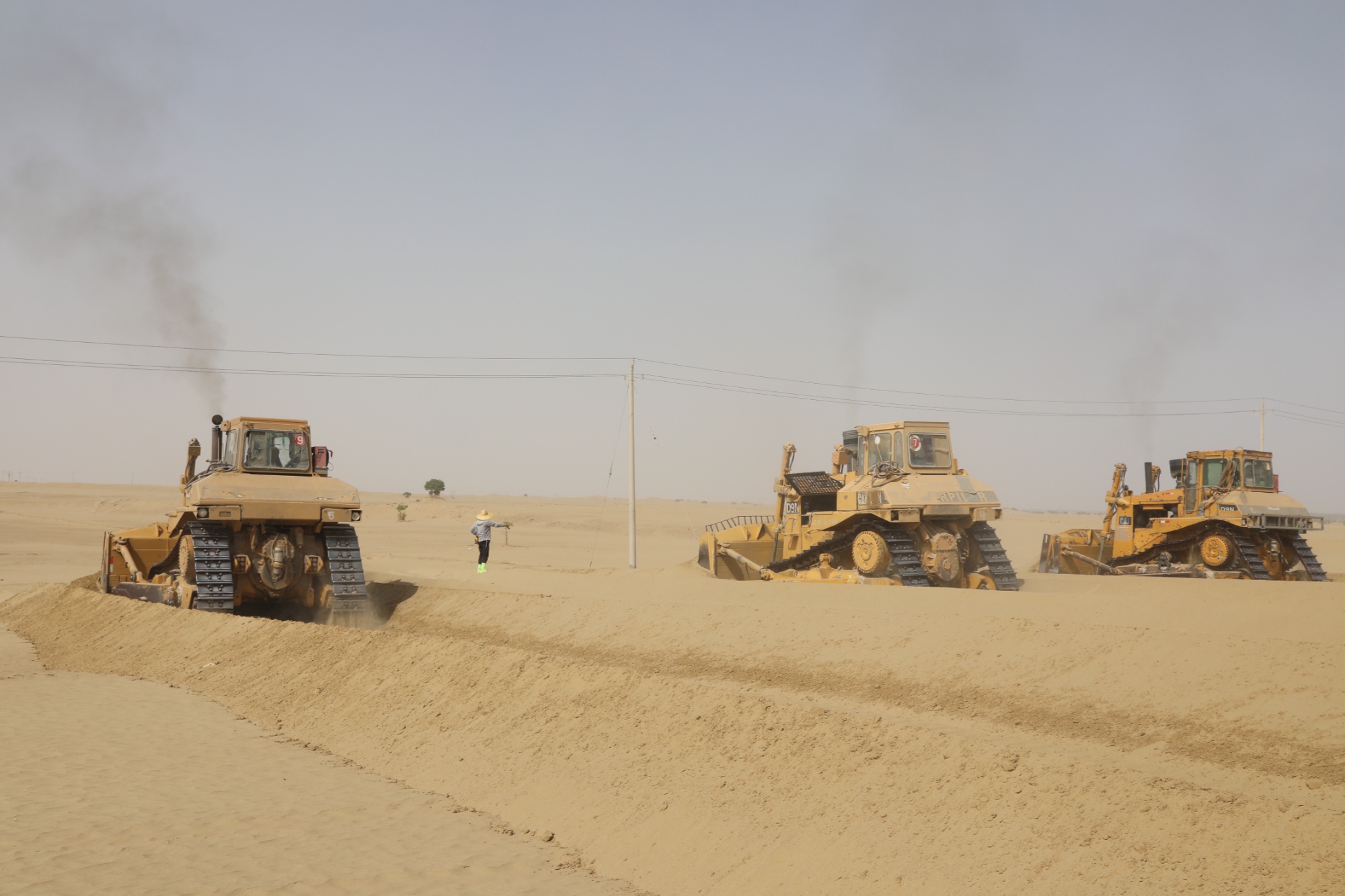 防沙治沙項(xiàng)目現(xiàn)場(chǎng),大型機(jī)械正在平整沙漠 (日孜完古麗·買吐地 攝)
