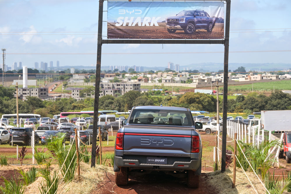 2025年4月29日,在巴西圣保羅州里貝朗普雷圖市舉行的2025年巴西農(nóng)業(yè)科技展上,一輛比亞迪皮卡進行越野演示。新華社記者 陳昊佺 攝