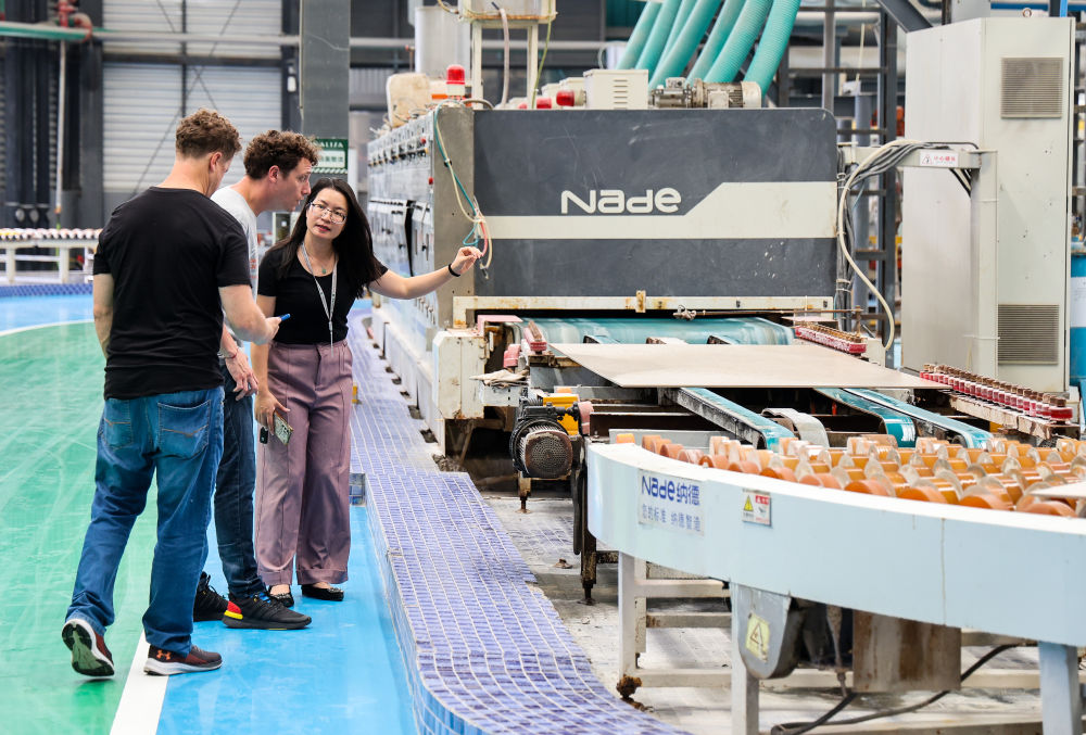 2025年4月22日,兩名參加廣交會的阿根廷采購商專程來到佛山參觀蒙娜麗莎大尺寸陶瓷巖板自動生產(chǎn)線。新華社記者 劉大偉 攝