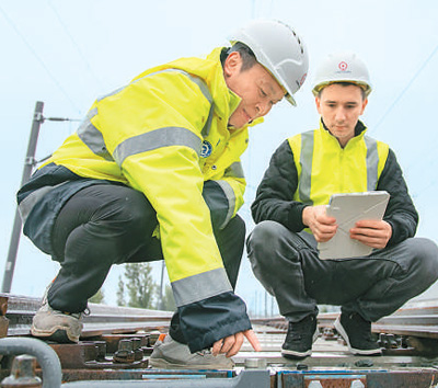 在塞爾維亞諾維薩德的匈塞鐵路塞爾維亞段項(xiàng)目部營(yíng)地,中國(guó)員工段偉(左)與外籍員工一起檢查軌道施工情況。