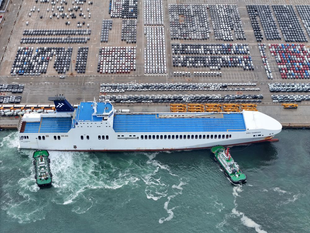 6月29日,汽車運輸船停靠山東港口煙臺港,準(zhǔn)備裝運出口汽車(無人機照片)。新華社發(fā)(唐克 攝)
