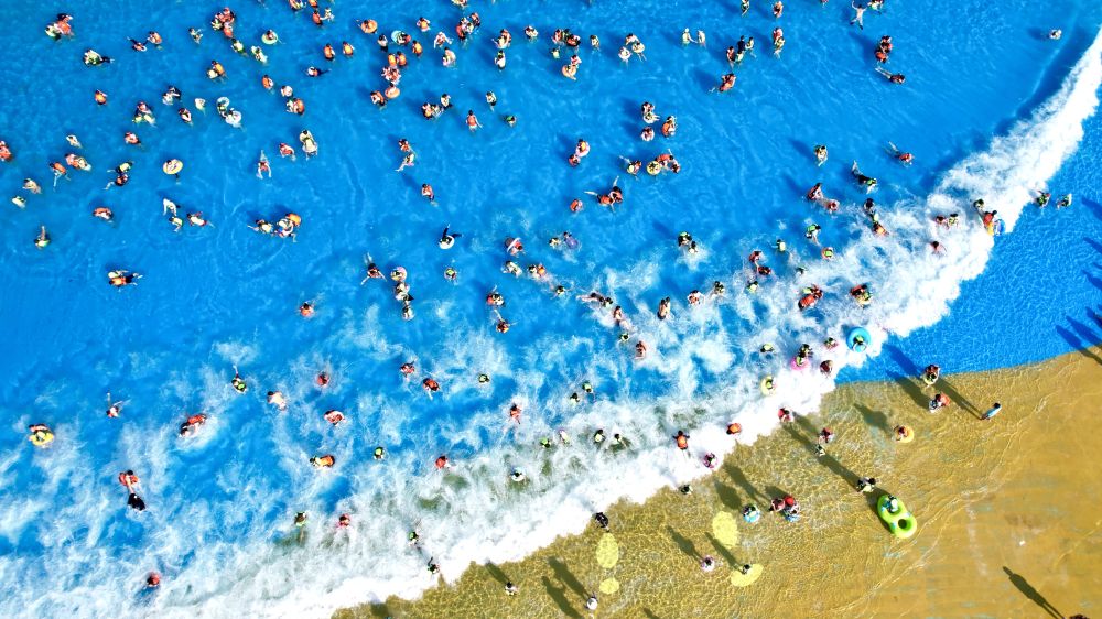 7月5日,浙江省湖州市長興縣太湖圖影旅游度假區(qū)龍之夢樂園嬉水世界,游客親水消暑(無人機照片)。新華社發(fā)(吳拯 攝)