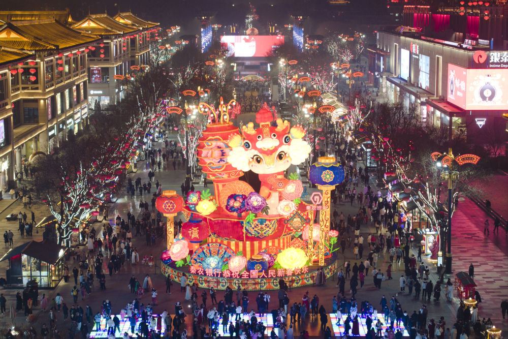 市民游客在西安大唐不夜城游玩(1月22日攝,無人機(jī)照片)。新華社記者邵瑞攝