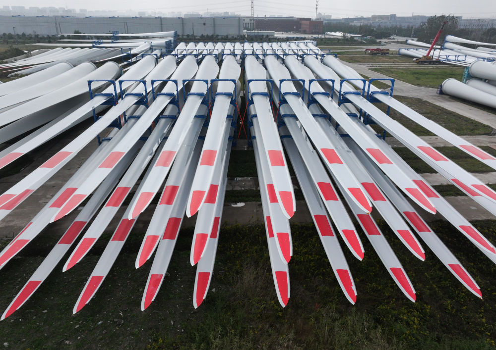 這是2024年11月2日在重通成飛風(fēng)電設(shè)備江蘇有限公司拍攝的風(fēng)力發(fā)電機(jī)組葉片(無人機(jī)照片)。新華社記者宋彥樺攝
