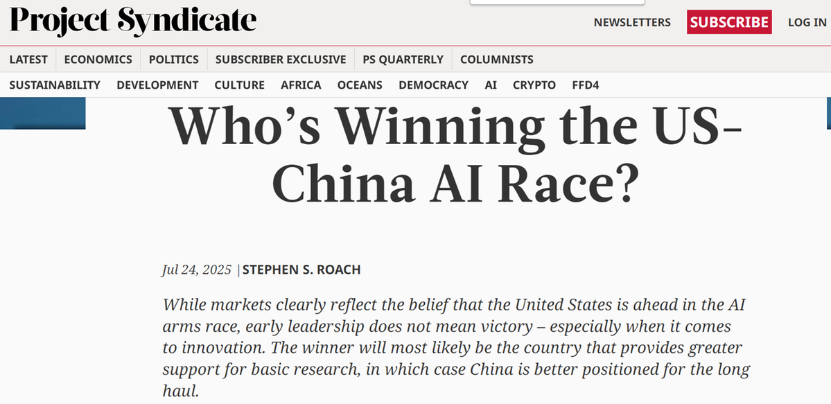 美國摩根士丹利亞洲區(qū)前主席斯蒂芬·羅奇在報(bào)業(yè)辛迪加網(wǎng)站(Project Syndicate)發(fā)表文章指出,全球人工智能(AI)競賽的勝負(fù)取決于基礎(chǔ)研究的投入,而非短期市場表現(xiàn)。羅奇認(rèn)為,中國憑借產(chǎn)業(yè)生態(tài)、研發(fā)投入和文化傳統(tǒng),使其在長期競爭中占據(jù)優(yōu)勢。