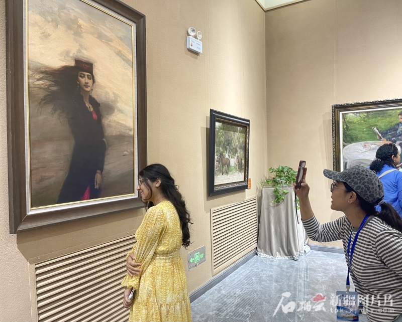8月2日,北京大學(xué)留學(xué)生在油畫作品前打卡拍照。石榴云/新疆日報記者 趙西婭攝
