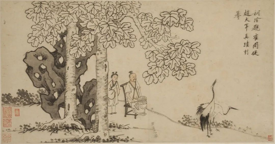 △明 沈周(款)山水人物大冊(之六 桐陰觀鶴),天津博物館藏。