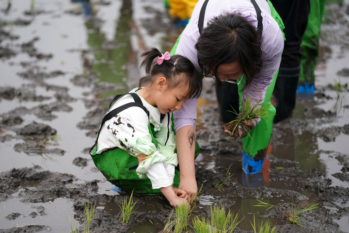 2024年5月4日,在太原市晉源區(qū)晉祠鎮(zhèn)北大寺村的稻田里,小朋友和家長(zhǎng)在體驗(yàn)插秧。新華社記者 詹彥 攝