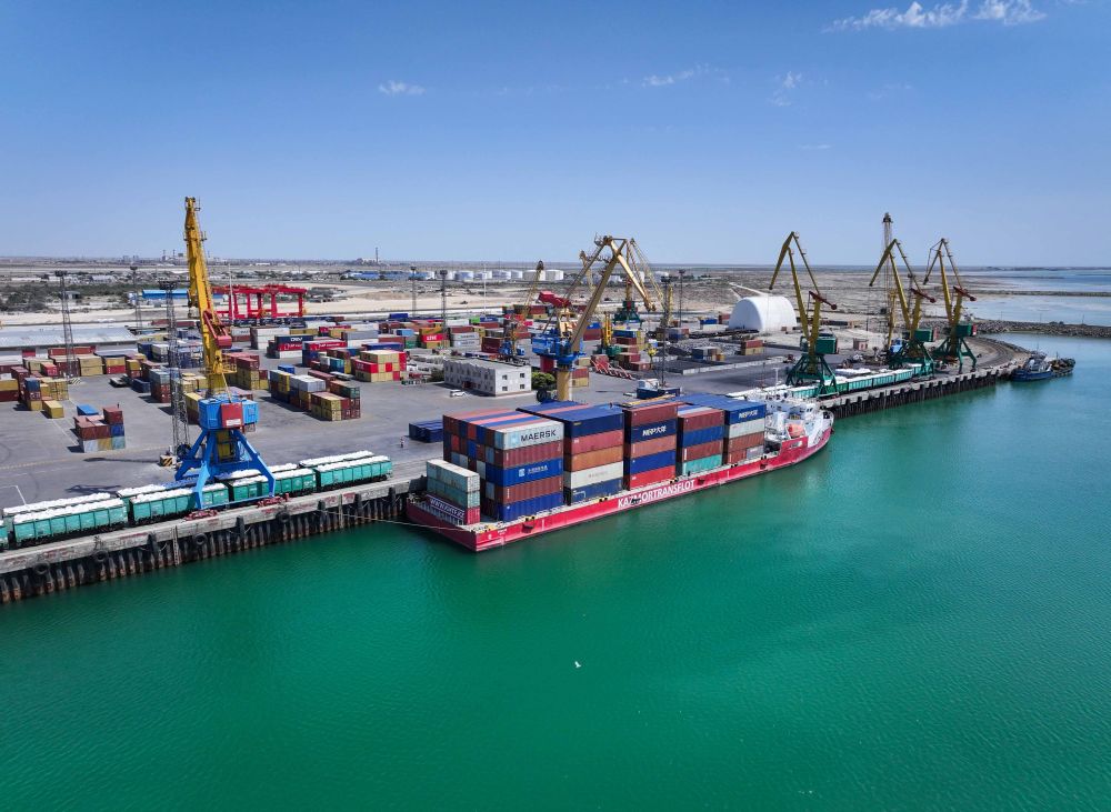 8月6日,一艘貨輪??吭诠_克斯坦阿克套港(無(wú)人機(jī)照片)。新華社記者 李任滋 攝