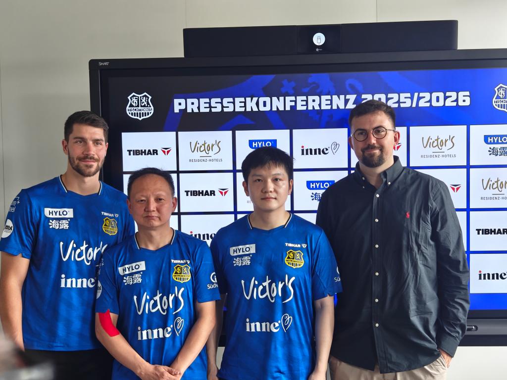 8月27日,中國(guó)乒乓球運(yùn)動(dòng)員樊振東(右二)出席德國(guó)乒乓球甲級(jí)聯(lián)賽薩爾布呂肯俱樂(lè)部的新賽季發(fā)布會(huì)。新華社記者 趙建通 攝