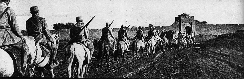 1945年8月,中國抗日武裝力量向日軍發(fā)起全面反攻。圖為八路軍晉綏部隊解放興和城,騎兵部隊列隊進城。新華社發(fā)