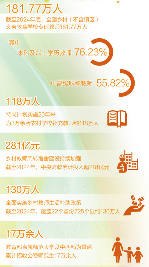 截至2024年底,全國(guó)鄉(xiāng)村(不含鎮(zhèn)區(qū))義務(wù)教育學(xué)校專任教師共181.77萬(wàn)人。扎根、堅(jiān)守,他們用愛(ài)心和智慧,點(diǎn)亮萬(wàn)千鄉(xiāng)村孩子的人生夢(mèng)想。
