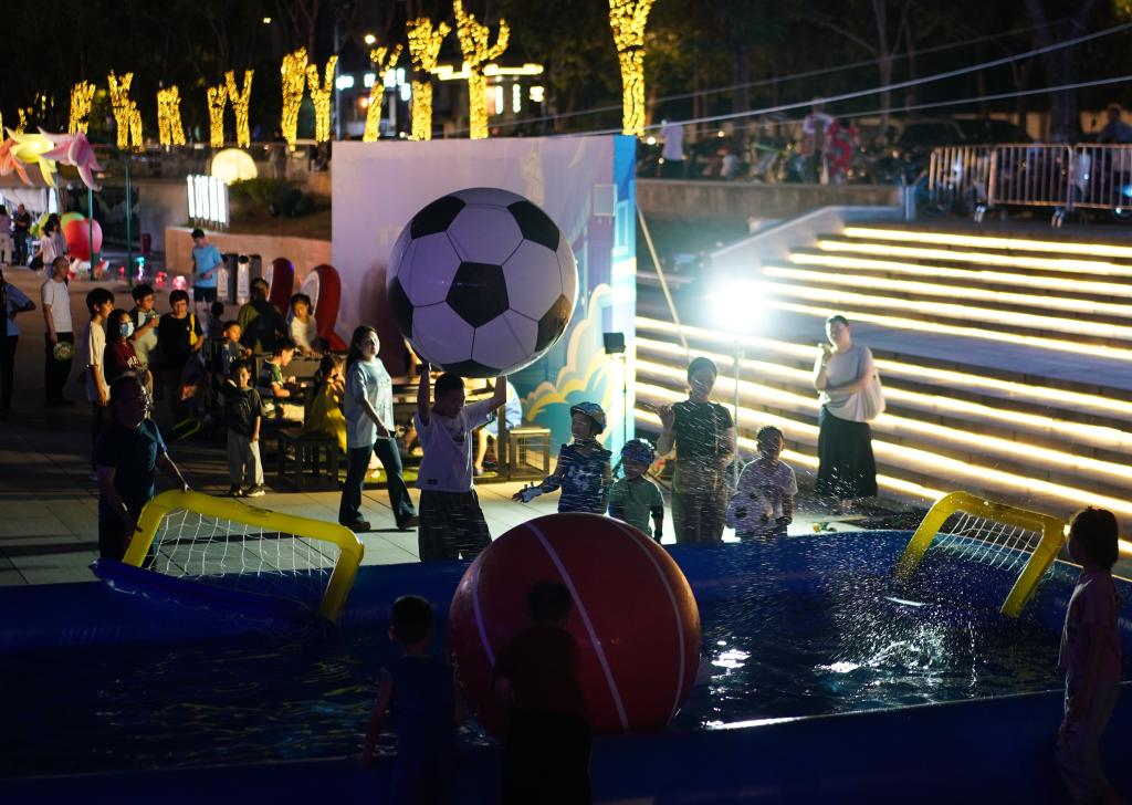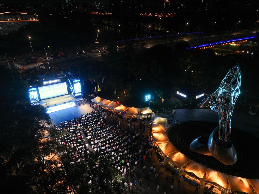8月17日,在江蘇南京舉行的2025江蘇省城市足球聯(lián)賽第九輪比賽中,南京隊對陣鹽城隊。南京市在部分商場、街區(qū)等地設(shè)置觀賽“第二現(xiàn)場”,使用大屏幕同步直播賽事,同時設(shè)有游戲互動區(qū)、煙火市集區(qū),讓球迷們度過歡樂時光。新華社記者 季春鵬 攝
