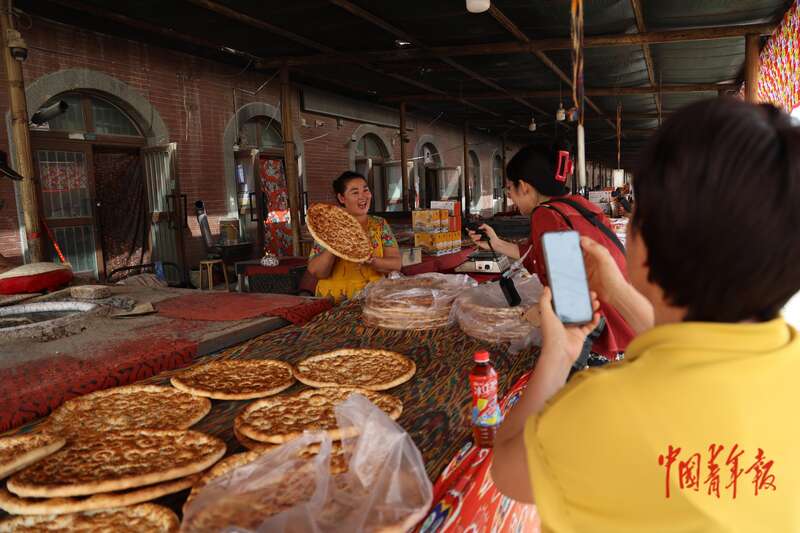 9月9日,新疆巴州尉犁縣興平鎮(zhèn)達西村,店主向顧客展示新疆馕。毗鄰尉犁縣城的達西村打造了商業(yè)街、民宿風情一條街,現(xiàn)有36家風情園、9家民宿,旅游業(yè)成為當?shù)卮迕裥碌脑鍪拯c。中青報·中青網(wǎng)記者 王鑫昕/攝