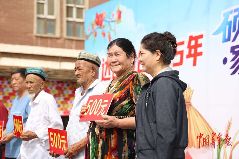 9月9日,新疆巴州尉犁縣興平鎮(zhèn)達西村,一場慶豐收活動上,達西村黨委書記夏提古麗·熱合曼(右一)代表村集體向該村長者發(fā)放慰問金。通過棉花種植、文化旅游等,2024年達西村集體收入達230.55萬元。中青報·中青網(wǎng)記者 王鑫昕/攝