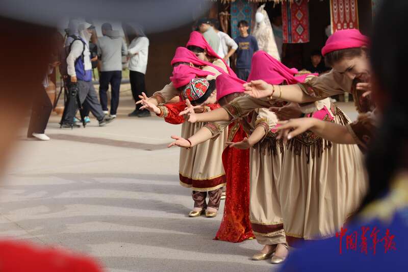 9月9日,新疆巴州尉犁縣羅布人村寨景區(qū),游客和當?shù)匮輪T一起跳舞。羅布人村寨集沙漠、河流、湖泊、森林、草原等自然景觀與獨特的羅布淖爾民俗文化景觀于一體,是外地游客體驗新疆風情的重要一站,深受人們喜愛。中青報·中青網(wǎng)記者 王鑫昕/攝