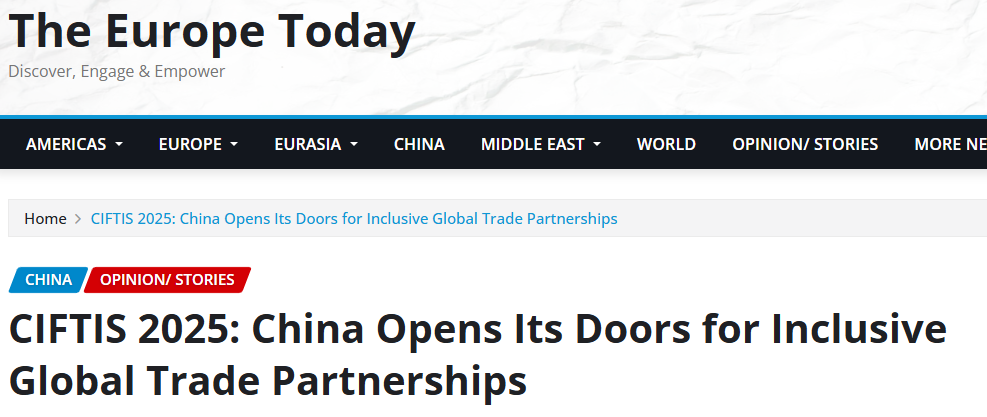 今日歐洲網(wǎng)站(The Europe Today)13日的報(bào)道指出,服貿(mào)會(huì)展示了中國(guó)對(duì)包容、開(kāi)放和前瞻性的服務(wù)貿(mào)易的承諾。中國(guó)持續(xù)擴(kuò)大市場(chǎng)準(zhǔn)入,為全球企業(yè)創(chuàng)造廣闊機(jī)遇。