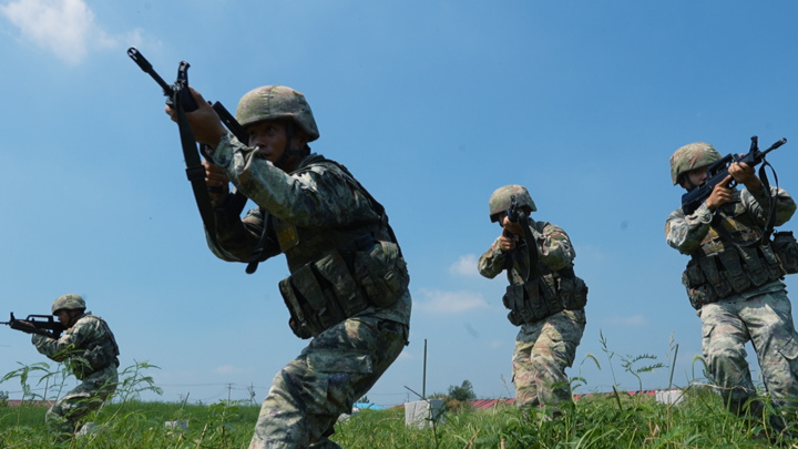 烈日灼人,汗水混雜著泥土粘在作訓(xùn)服上。但戰(zhàn)士們一絲不茍,目光如炬,動(dòng)作凌厲,搜索、突擊、越障、匍匐……一舉一動(dòng)彰顯著人民軍隊(duì)的凜然軍威與中國(guó)軍人的過(guò)硬本領(lǐng)。?