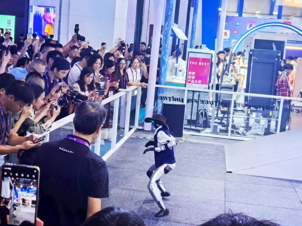 在東博會(huì)宇樹科技展位,機(jī)器人在表演熱舞。新華社記者王楚然 攝
