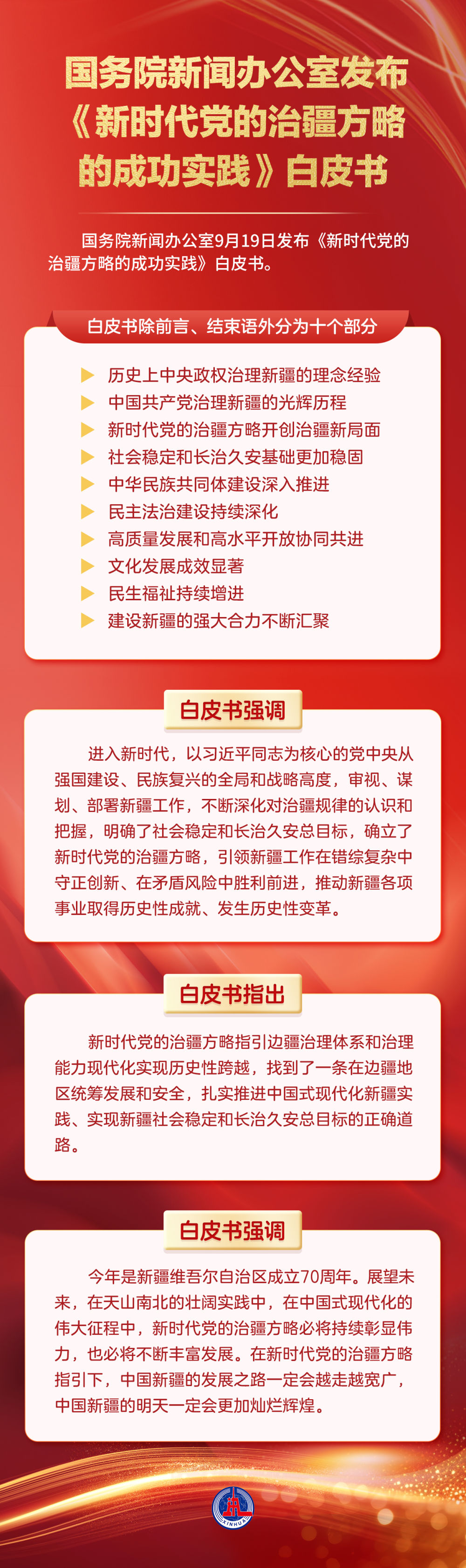 國(guó)務(wù)院新聞辦公室9月19日發(fā)布《新時(shí)代黨的治疆方略的成功實(shí)踐》白皮書(shū)。