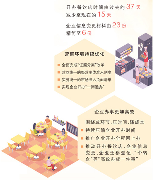 原先需要手動填寫的信息變?yōu)橄到y(tǒng)智能生成,申請人只需勾選和核對;表單的流轉(zhuǎn)從線下紙質(zhì)層層傳遞,變?yōu)橄到y(tǒng)上動動手指就可辦理……餐飲“一件事”改革后,營業(yè)執(zhí)照實現(xiàn)了上午提交、下午出證,食品經(jīng)營許可證辦理時間也從20個工作日縮短到三四天。