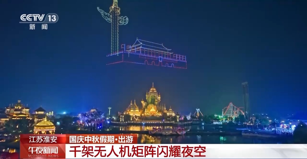 夜幕降臨,在江蘇淮安西游樂園,1600架無人機同步升空,組成“我愛你中國”、天安門、璀璨中國等造型圖案,科技與光影的碰撞,譜寫了一曲璀璨奪目的 “空中詩篇”。全新升級的“國慶煙花大會”更是將現(xiàn)場氛圍推向高潮。絢爛的煙花與水幕交織相映,形成了一幅立體畫卷,營造出了既浪漫又熱烈的節(jié)日氛圍。